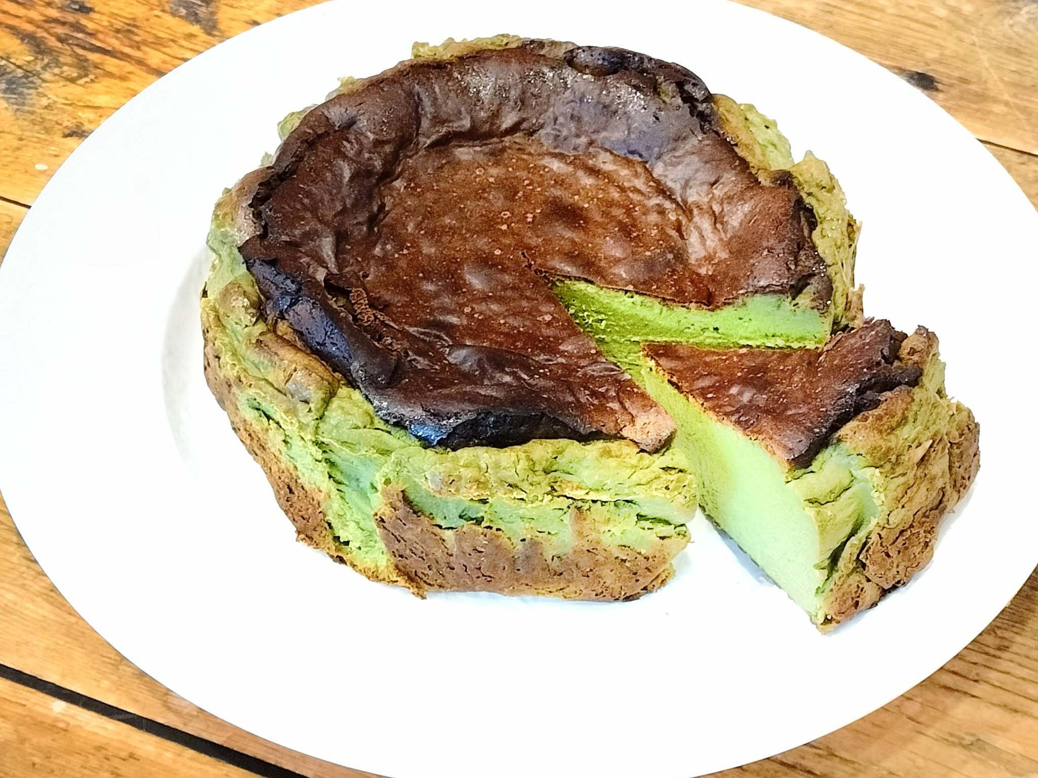 外はこんがり香ばしく、中はとろっとなめらかな抹茶の風味豊かなバスクチーズケーキです。高温で短時間で焼き上げることで、この独特の食感が生まれます。