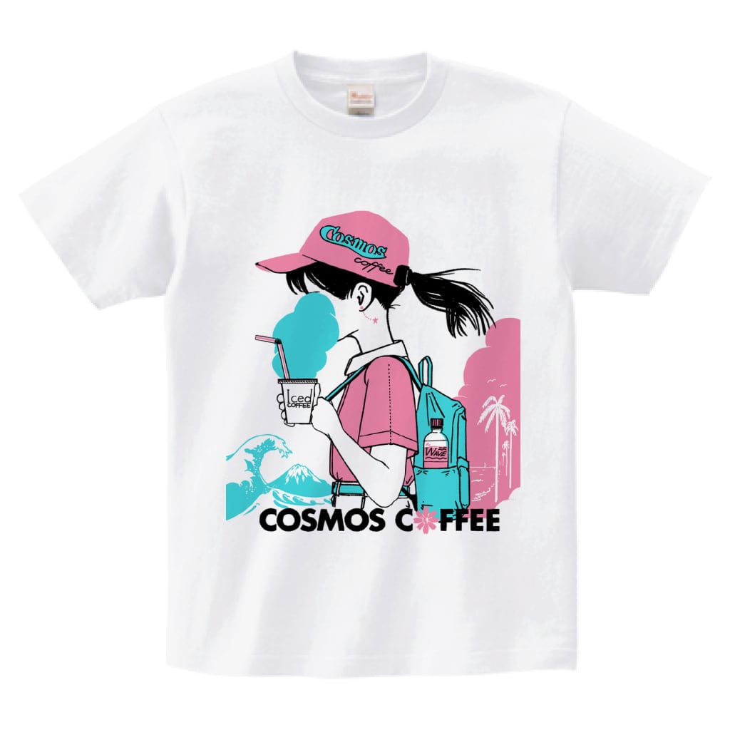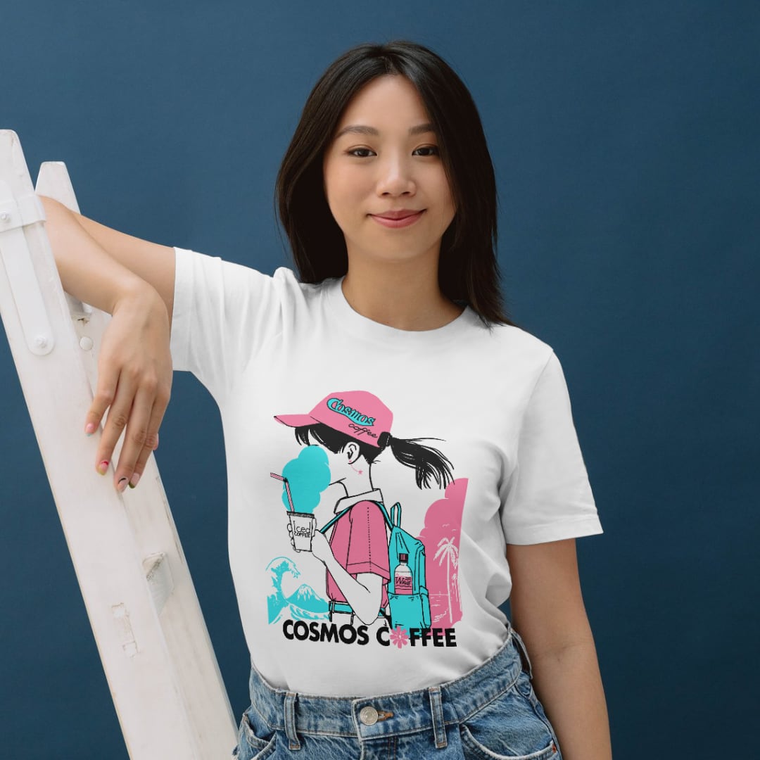 自家焙煎珈琲屋コスモスの新しい女の子のロゴがデザインされたTシャツです。